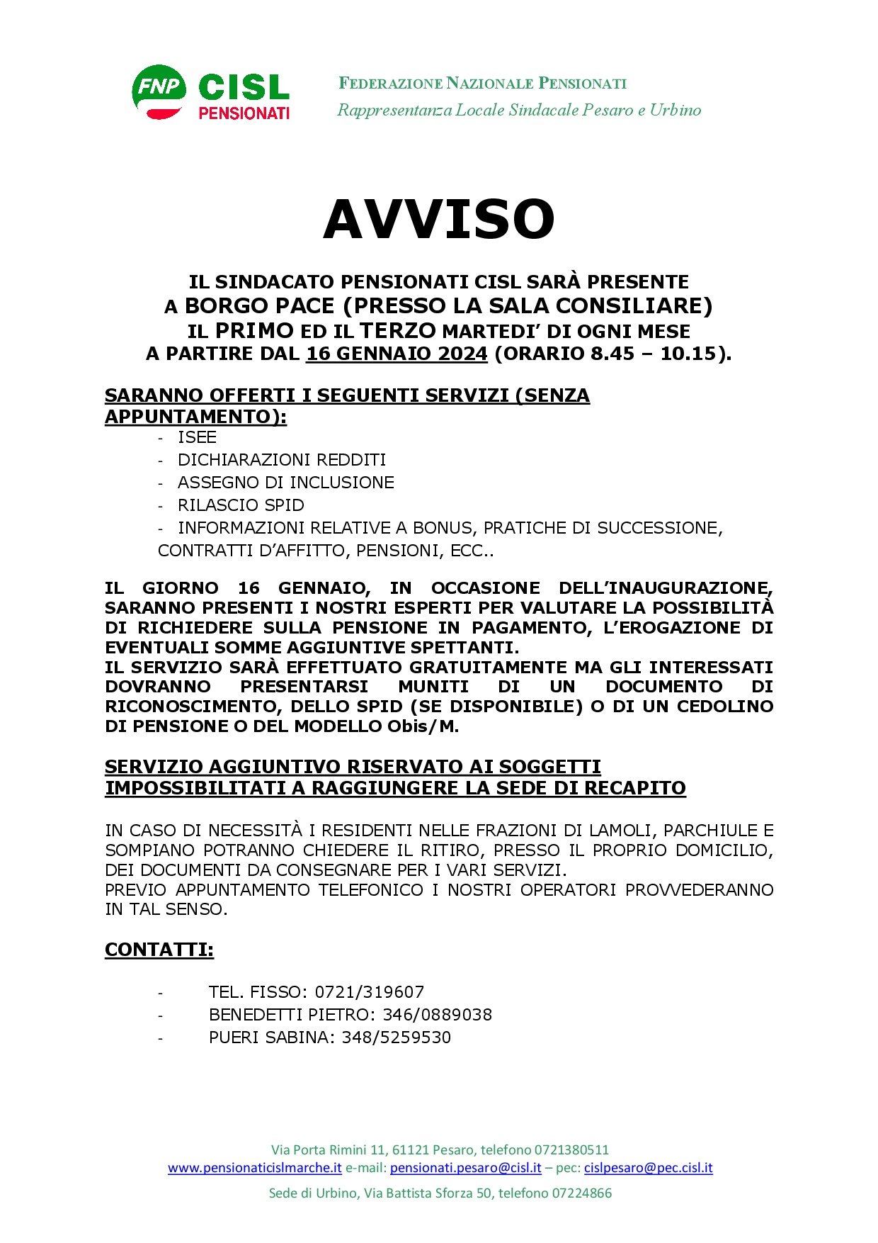 IL SINDACATO PENSIONATI CISL SARÀ PRESENTE A BORGO PACE (PRESSO LA SALA CONSILIARE)